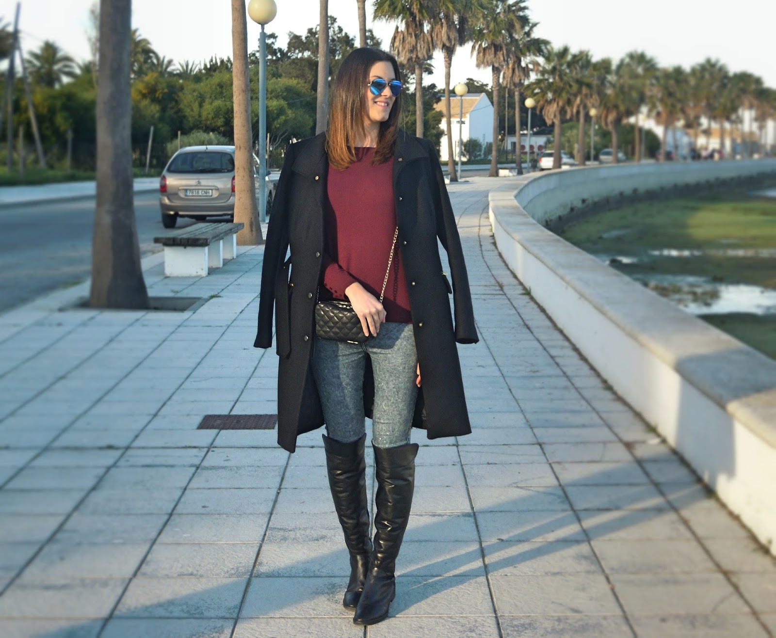 El gris y el burdeos es una bonita mezcla, por lo menos para mí, y queda muy bien con los complementos en dorado. Como el jersey es un poco fino me puse mi abrigo largo de Zara que tantas veces he usado tanto de día como de noche, y es que a estas alturas no separo la ropa en prendas para diario y prendas para salir. Ya todo vale.